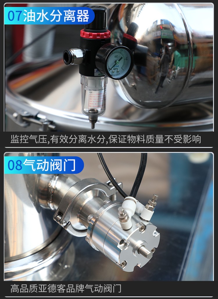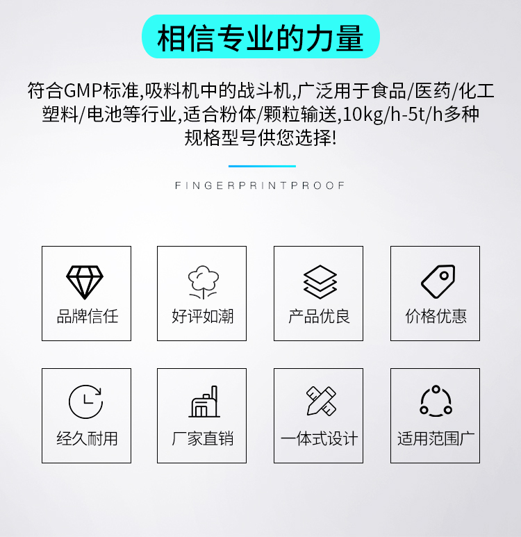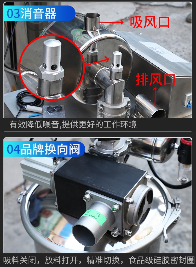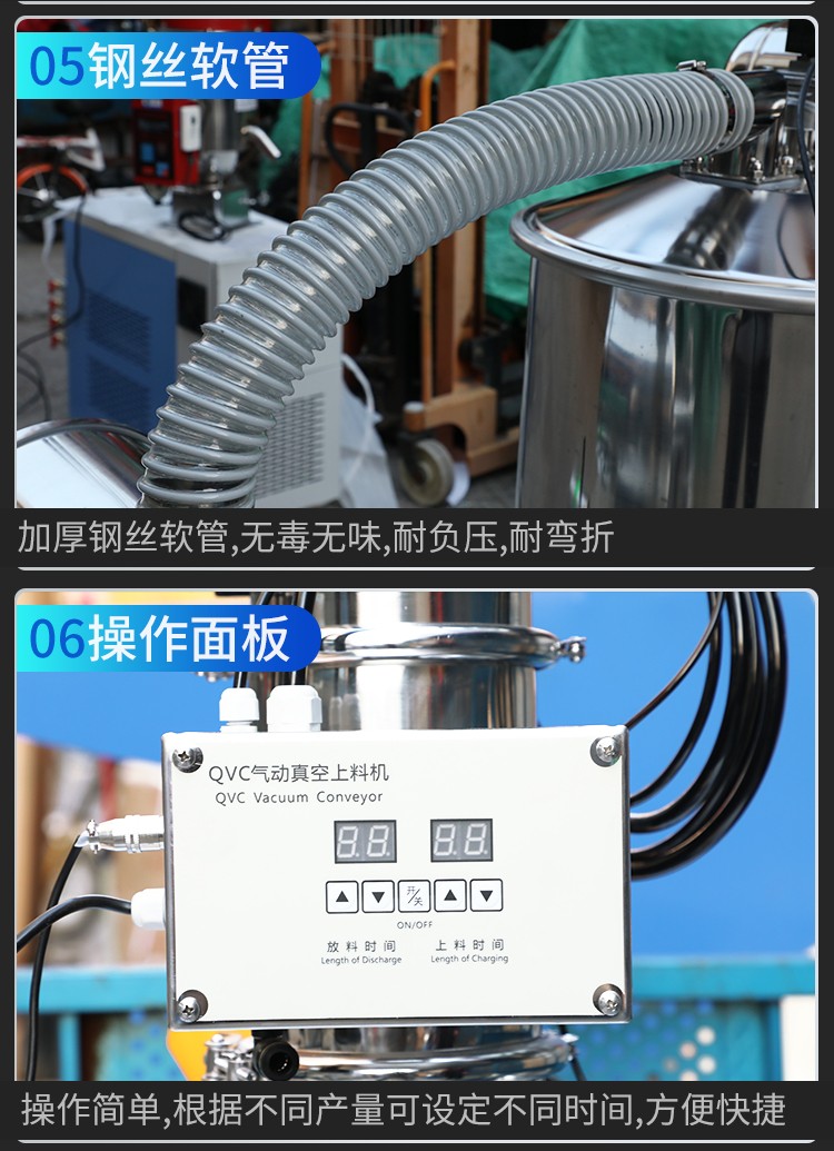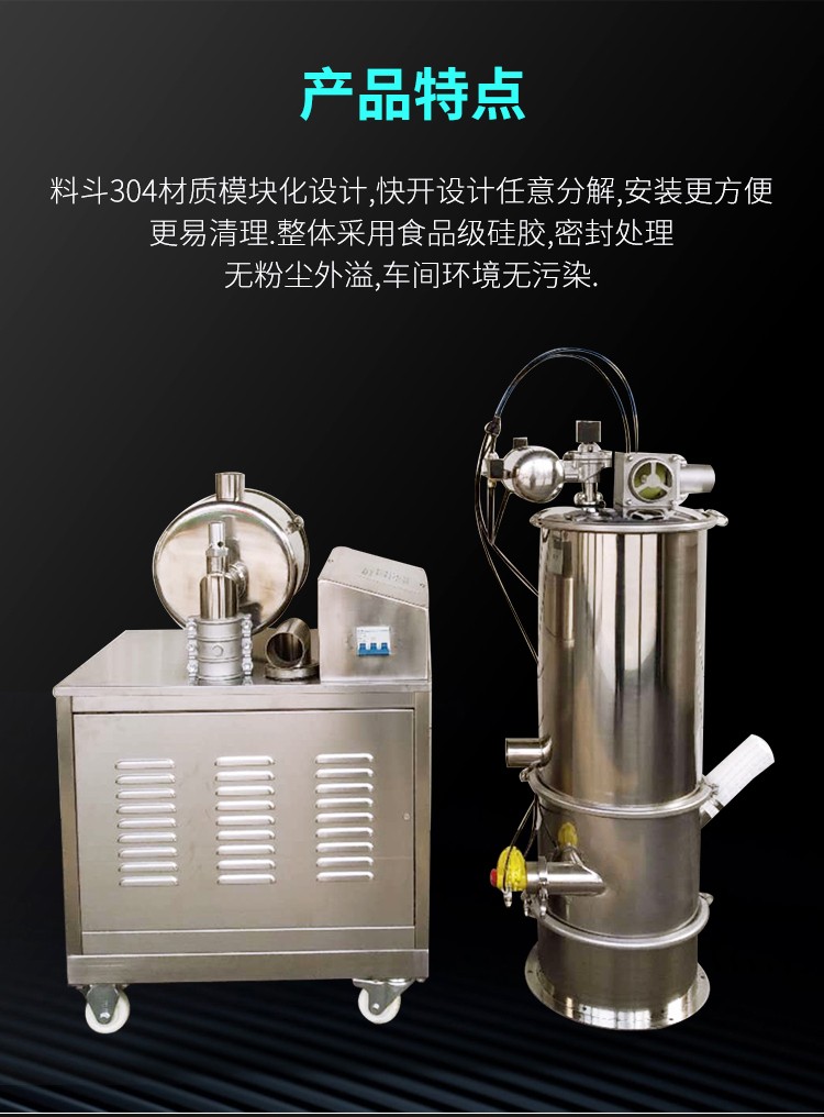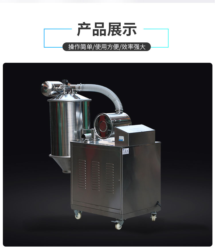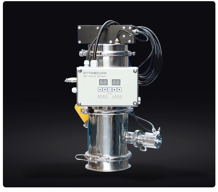 Product introduction真空上料機是一種粉狀料、粒狀料、粉粒混合料的真空輸送設備,是針對當前很多無塵車間,對環境要求比較嚴格的加工場地所設計的真空無塵輸送系統。真空上料機能自動地將各種物料輸送到包裝機、注塑機、粉碎機、化工加工設備等設備的料斗中, 也能直接把被混合的物料輸送到混合機(如V型混合機、 二維混合機)中, 減輕了工人的勞動強度,改善了工人們的作業環境, 解決了加料時粉塵外溢等問題, 是制藥廠, 食品廠化工廠,通過 "GMP"認證, 促進清潔、 文明生產的設備。
