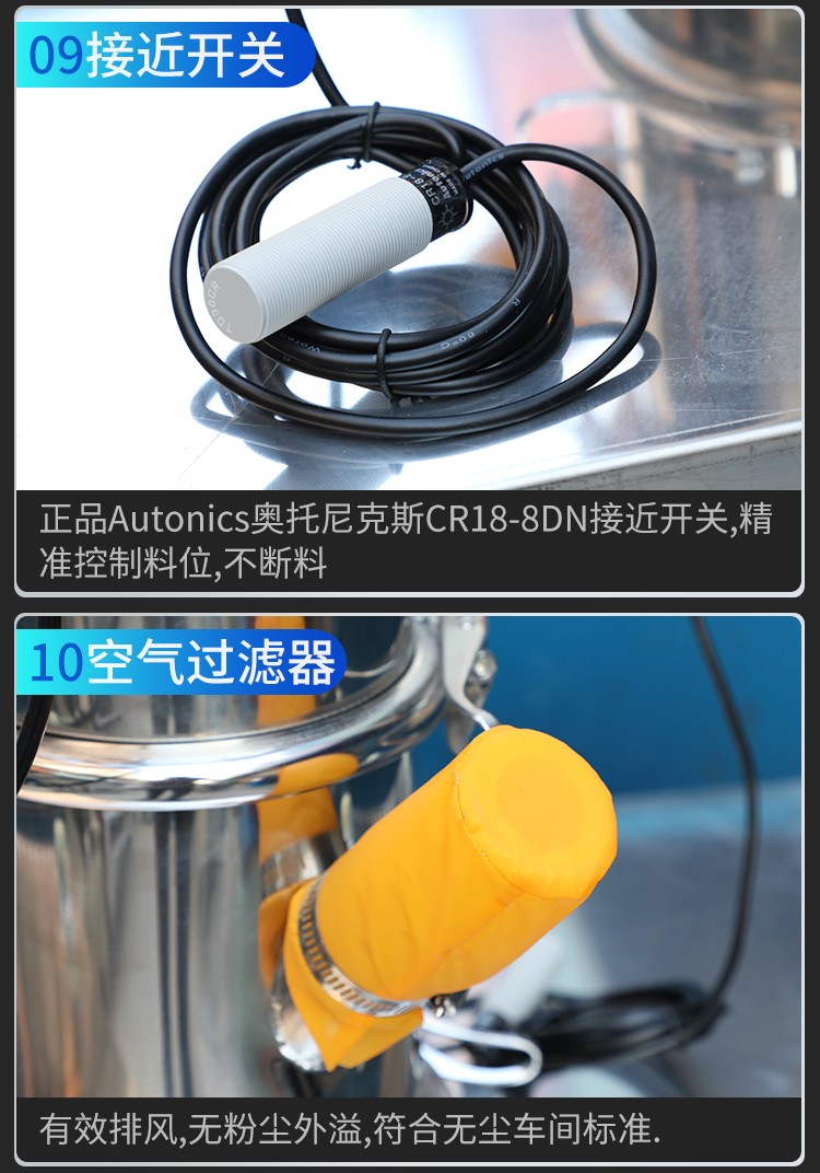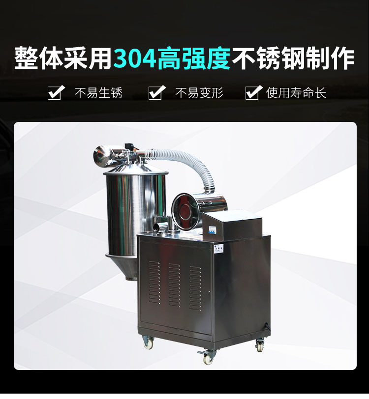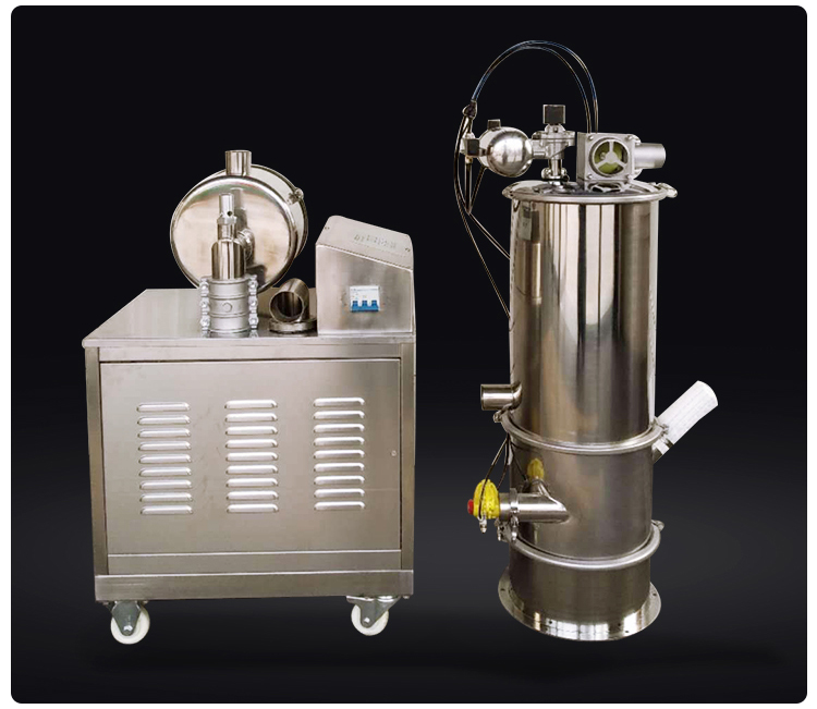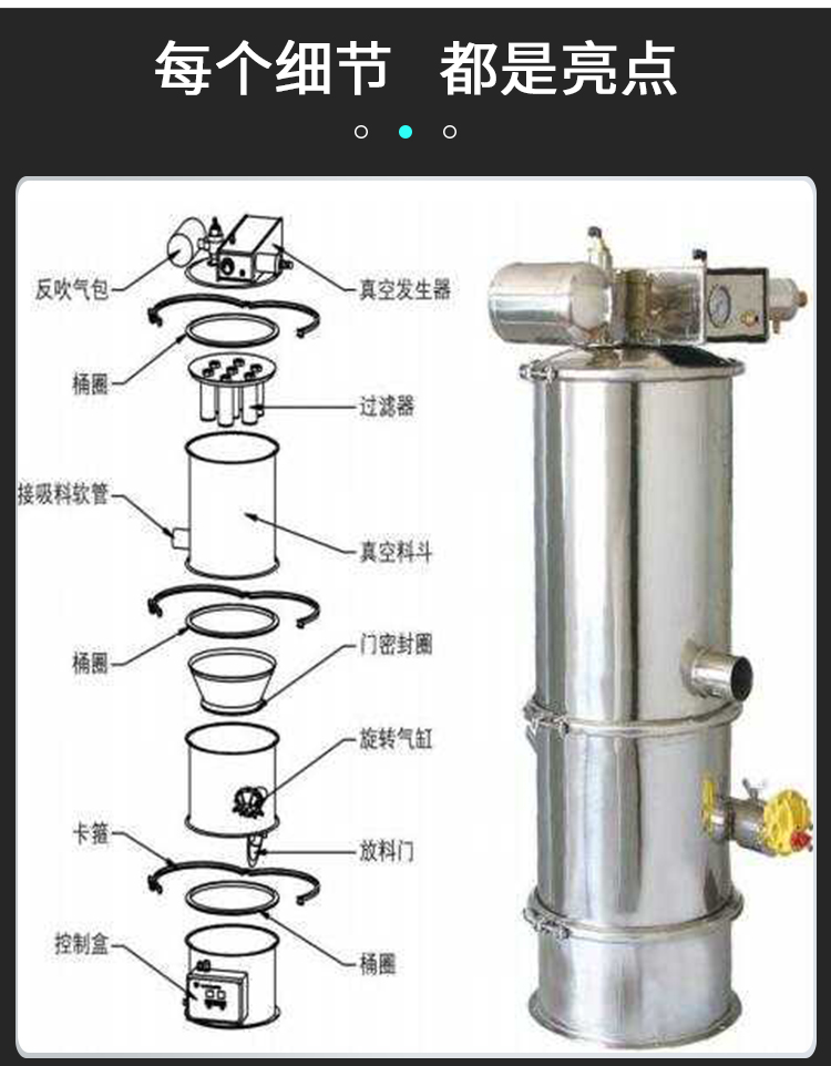 真空上料機由真空泵(旋渦風機,羅茨風機), 真空料斗, 過濾器(有布袋折皺過濾器、聚酯覆膜過濾器、PE過濾器、 316L不銹鋼過濾器多種選擇), 壓縮空氣反吹裝置,氣動放料門裝置,料位自動控制裝置, 不銹鋼吸料嘴,輸送軟管等組成, 整套系統設計合理, 制造精美。