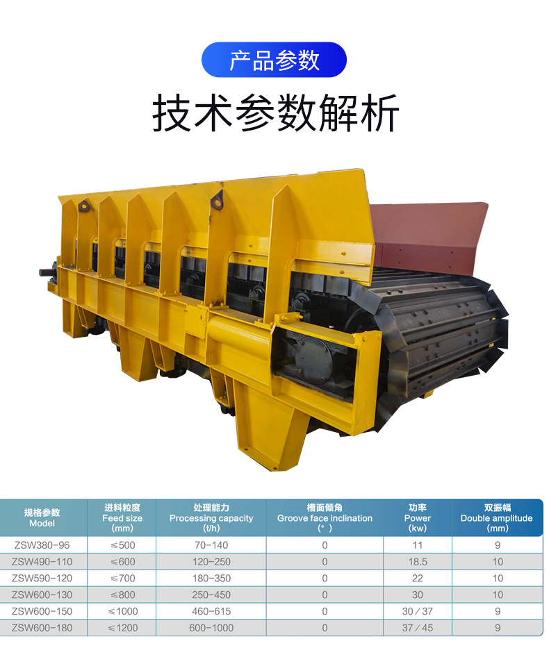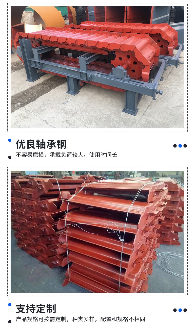 Product introduction板式給料機有輕型、中型、重型三種,其向上傾角20度。分別適用于沿水平或傾斜的線段由貯料倉向破碎機輸送機或其它工作機械與容器連續均勻地配給和輸送堆積密度分別為:輕型機為不大于1200kg/m3,塊重不超過140kg,溫度不高于350℃的各種塊狀和粒狀、散狀物料;中型機為不大于2400 kg/m3,塊重不超過500kg,溫度不高于400℃的各種松散物料;重型板式給料機規格有槽寬1000、1250、1500、2000、2500、3150毫米,長度為420米,多種型號的設定可滿足不同環境下的使用情況。