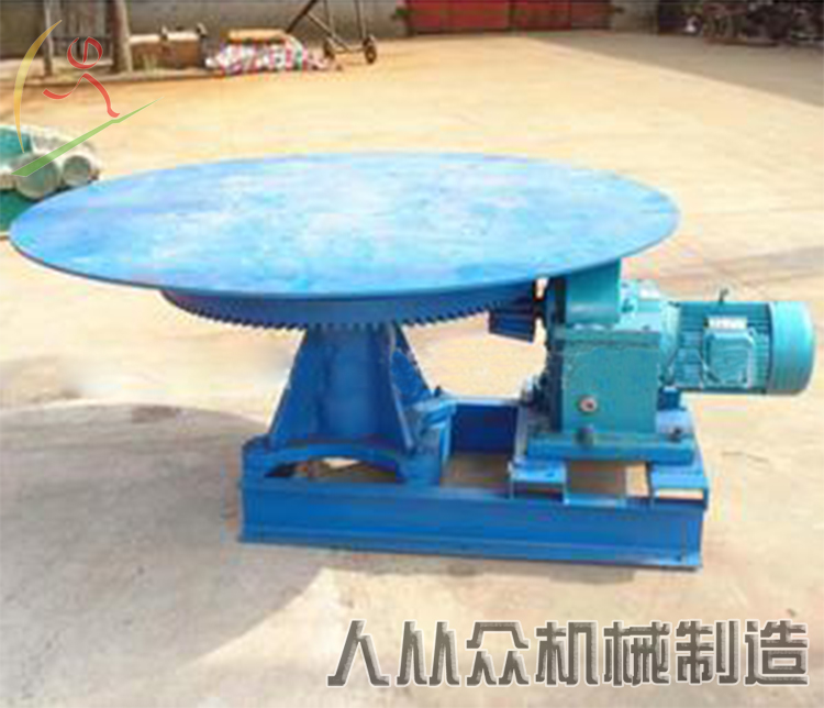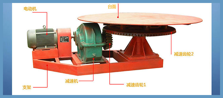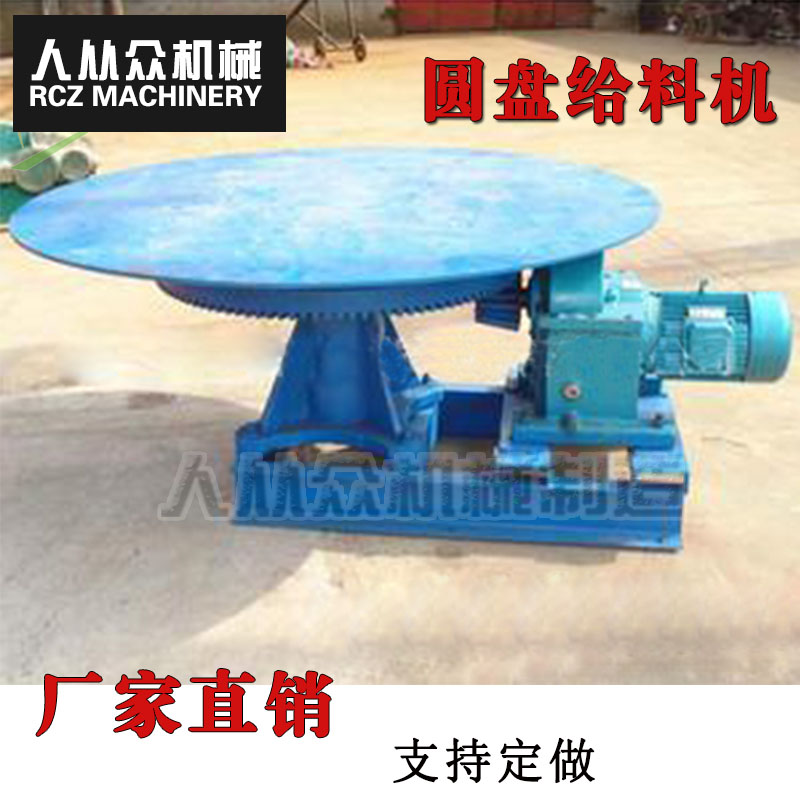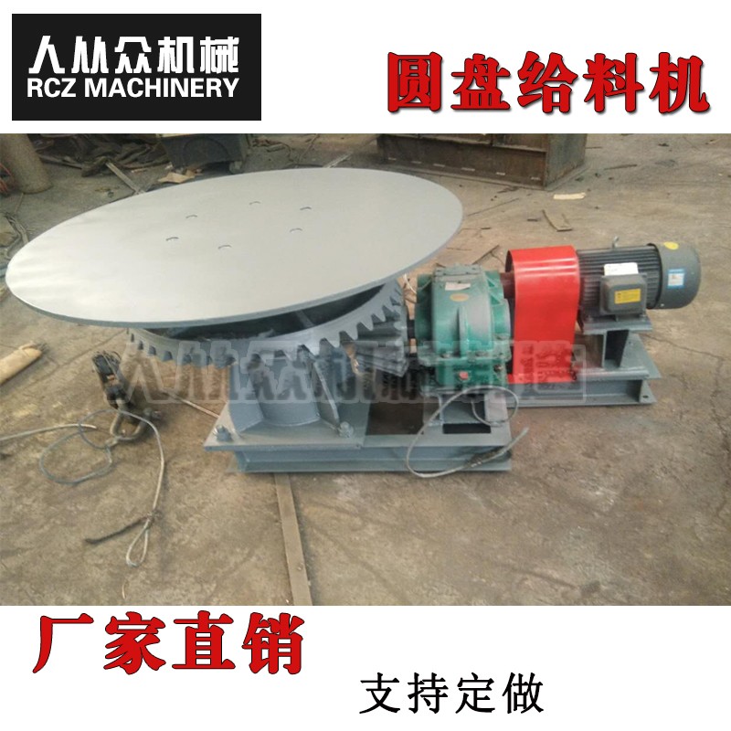 圓盤給料機,是由電動機直接驅動減速機構減速后,由減速輸出軸直接輸出動力,并直接驅動著圓盤作每分鐘5-55m的邊緣線速度的低速(0.7~10 r/min)轉動,通過卸料刮刀把料筒和圓盤間隙中溢出的≤50mm顆粒或粉狀物料劃落在給料機下面不同的輸送設備上,完成設計流程所需要的給配料作業。