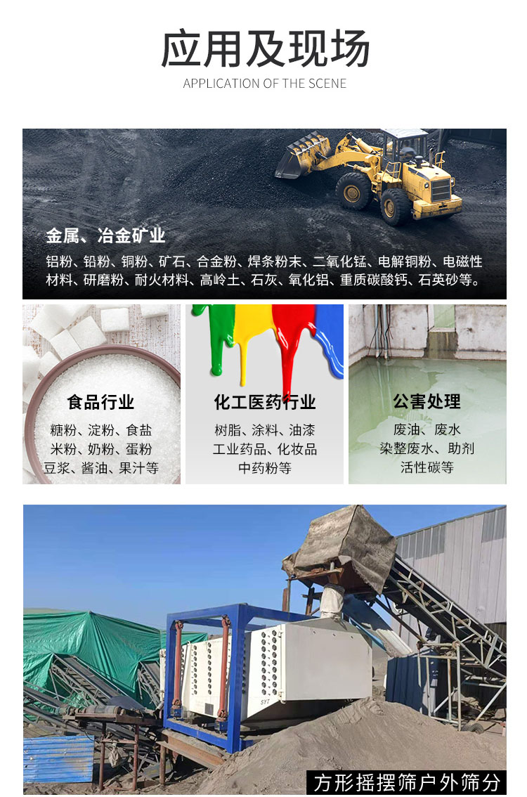 Product introduction方形搖擺篩系列篩機是滿足大產量、高精度需求的用戶而研發設計的一種篩分設備。它廣泛用于化工、冶金、礦業、飼料業、食品等多個行業。尤其適用于重堿、食鹽、樹脂、復合肥、大小顆粒尿素、飼料、還原鐵粉、氧化鋯、陶粒、重晶石等