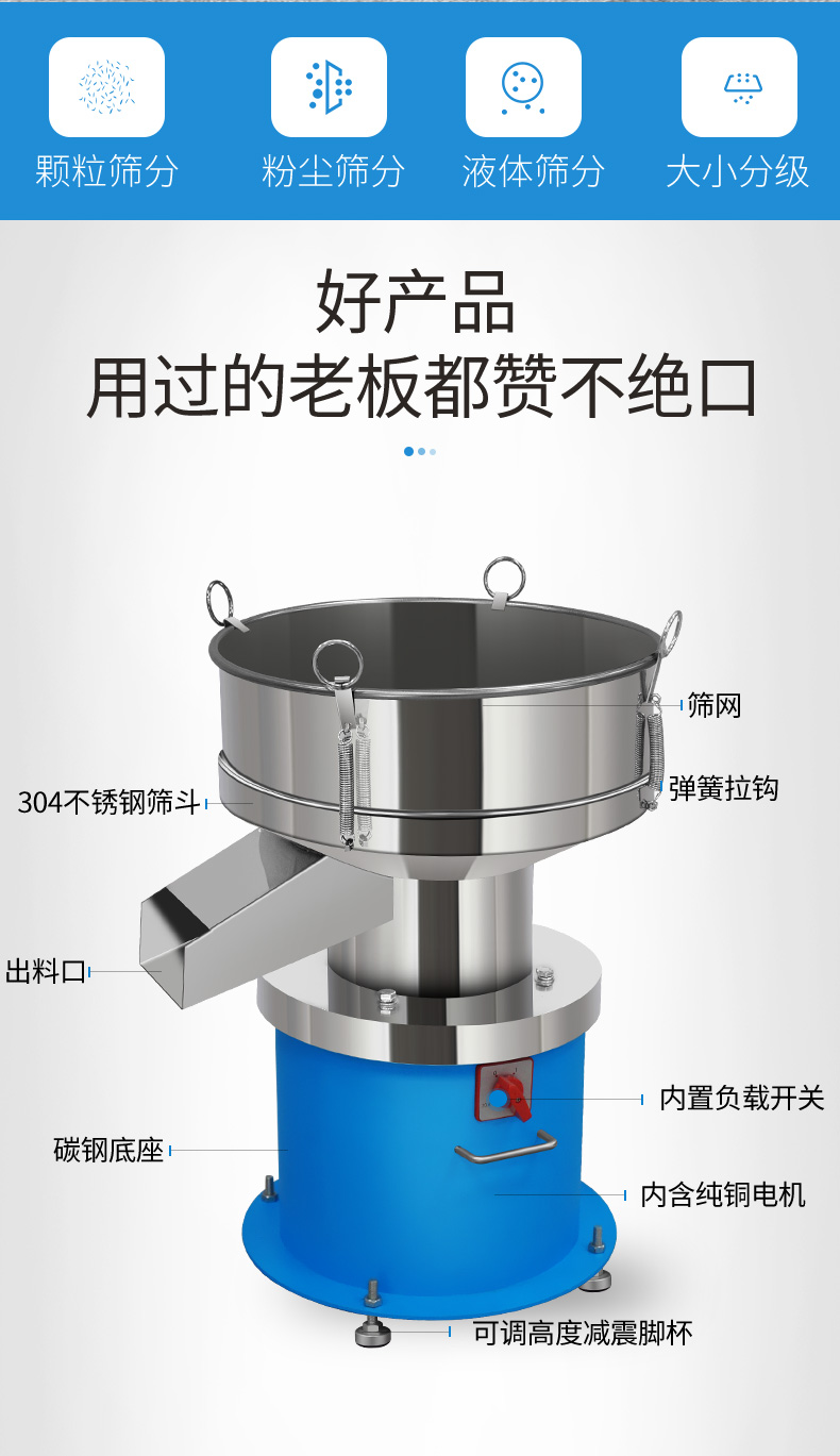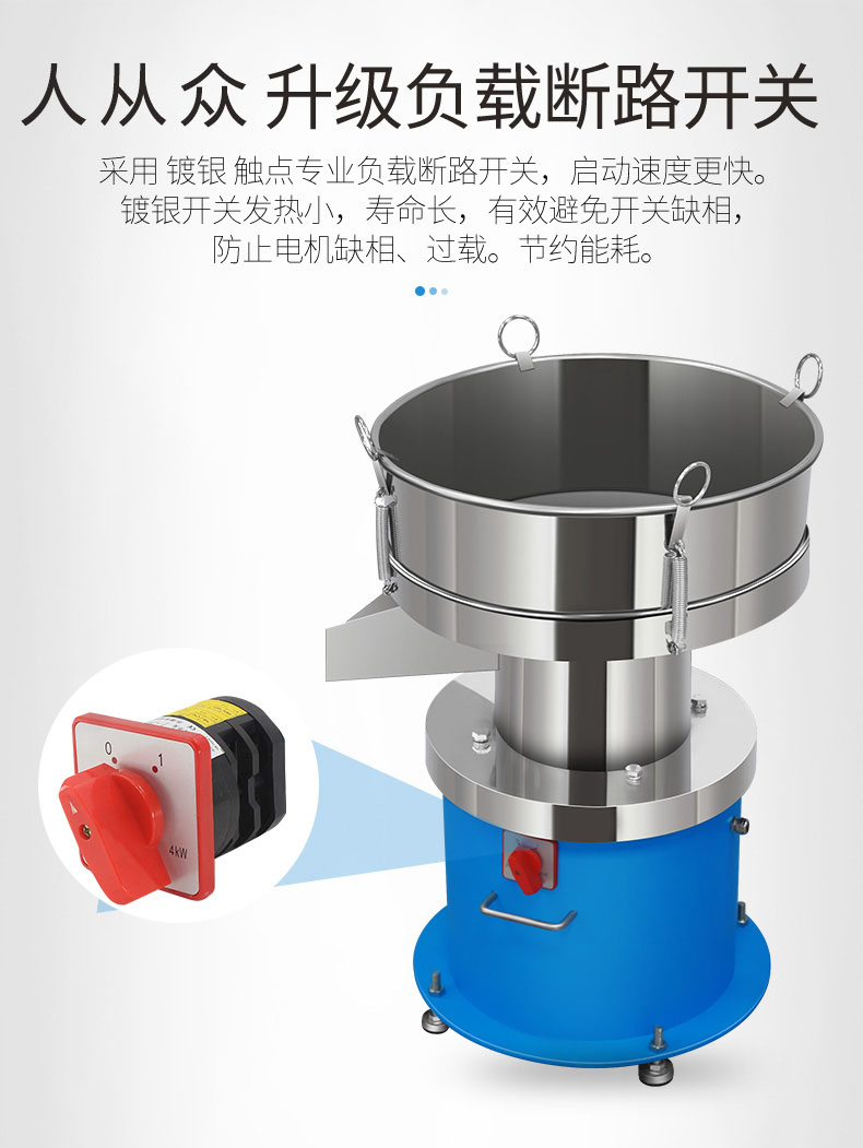 3. 混合物料從中央進入,經篩分后,各種粒度的物料各自的出口自動連續排出,可連續生產。