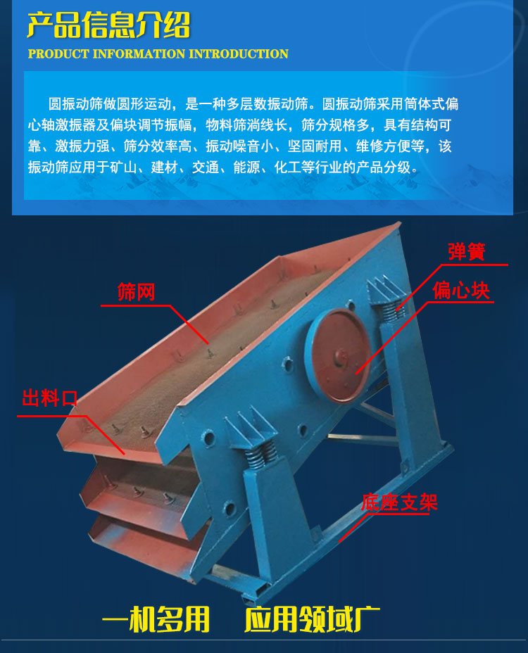 圓振動篩由振動源、篩體、篩網(wǎng)、減振裝置、底座等組成。