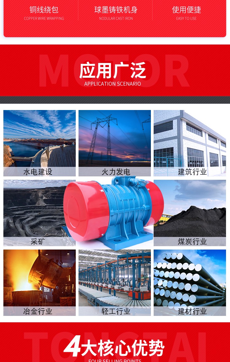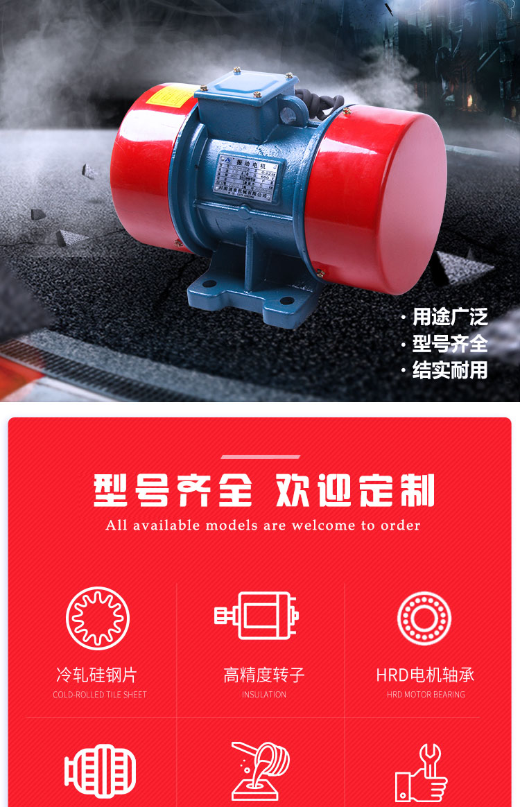 YZS振動電機的激振力利用率高、能耗小、噪音低、壽命長。振動電機的激振力可以無級調節,使用方便。YZS振動電機作為各類振動機械的激振源,可以應用于振動給料機、振動輸送機、振動放礦機、振動落砂機、振動篩分機等設備,YZS振動電機除了可以應用與一般振動機械外,還可以組合多種振動形式,所以被廣泛的應用在水電建設、火力發電、建筑、建材、化工、采礦、煤炭、冶金、輕工等領域。