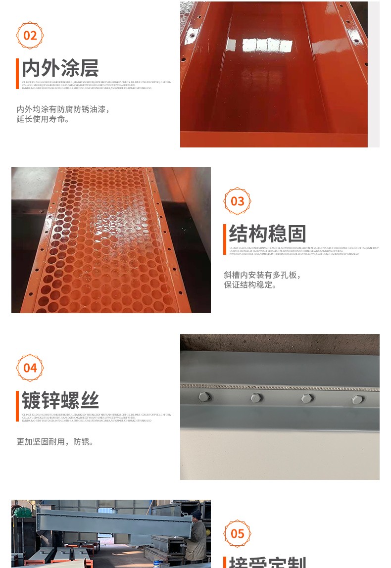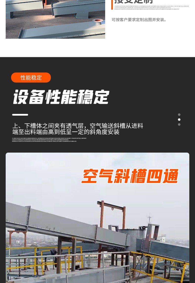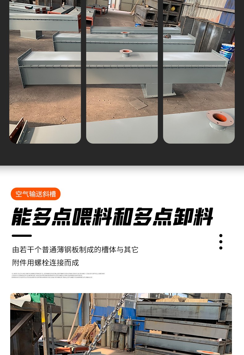 Product introduction風送斜槽是一種用于輸送干燥粉狀物料的氣力輸送設備又稱空氣輸送設備,由數個鑄鋼板鑄成的槽子連接而成,并沿其輸送方向布置成一定的斜度,槽子的上下殼體中間夾有氣層,物料隨氣體流動輸送。