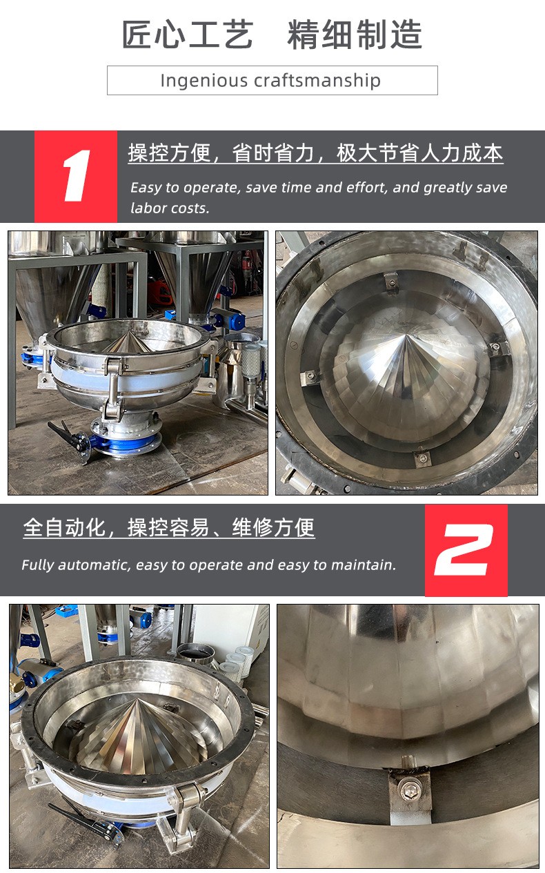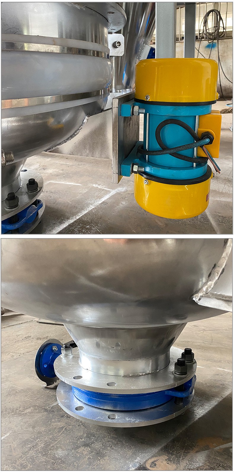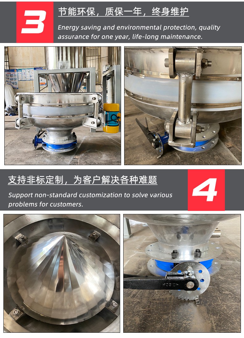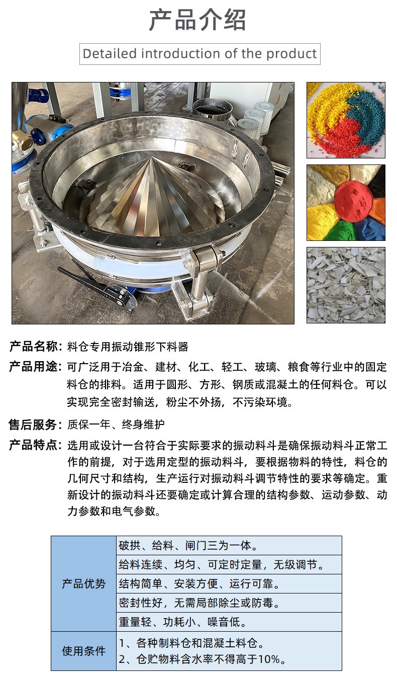 Product introduction振動給料斗破拱性能好,對于料倉內的各種粉狀及粒狀物料都能實現破拱和連續均勻排料,可消除不同粒度、不同比重的混合物料在進入料倉時的偏析現象。將振動電機接通電源,振動電機起振,其產生的激振力使給料斗在水平方向產生強烈的振動,此振動通過錐面或球面活化器將水平激振力分解為法向力和切向力,法向力呈放射狀傳遞到物料深處,切向力使物料受剪,從而消除倉內物料的起拱,使物料像流水一樣從出料口排出。切斷電源,振動電機停振,排料可停止。