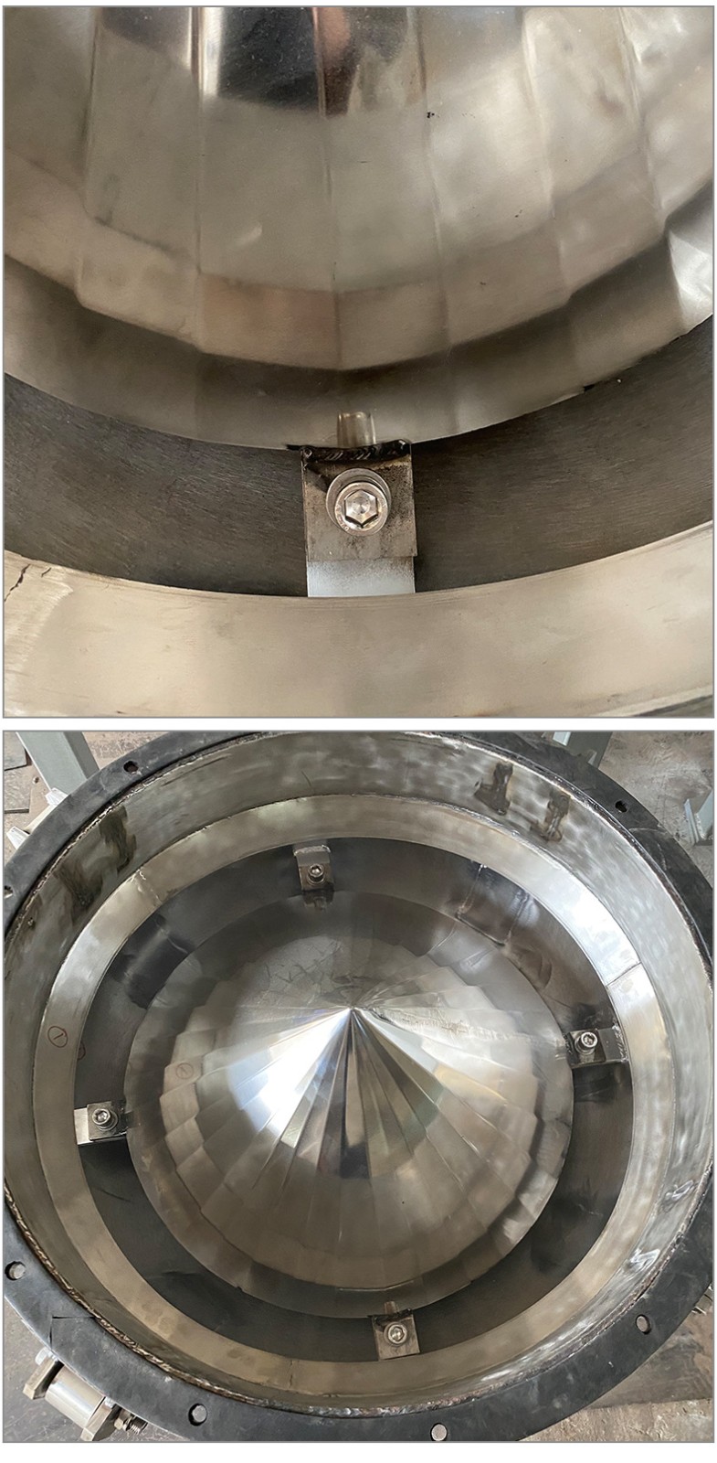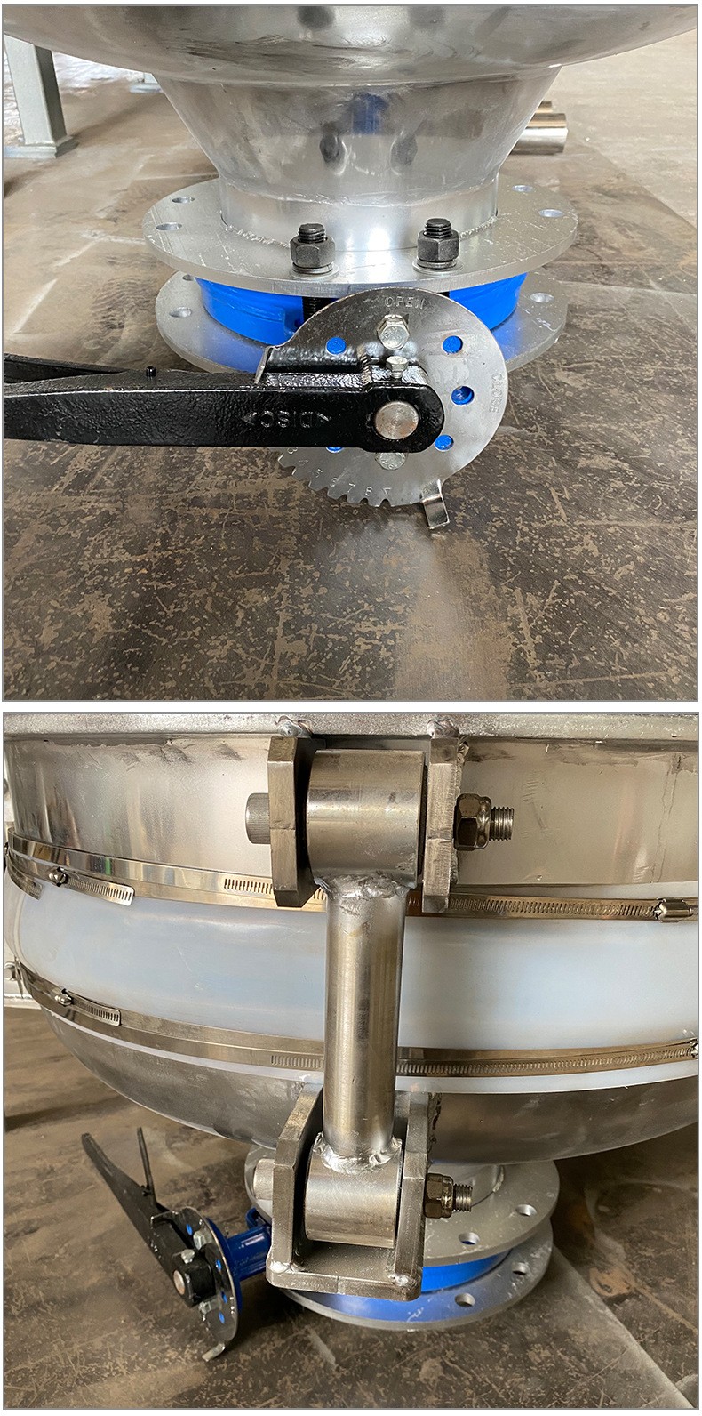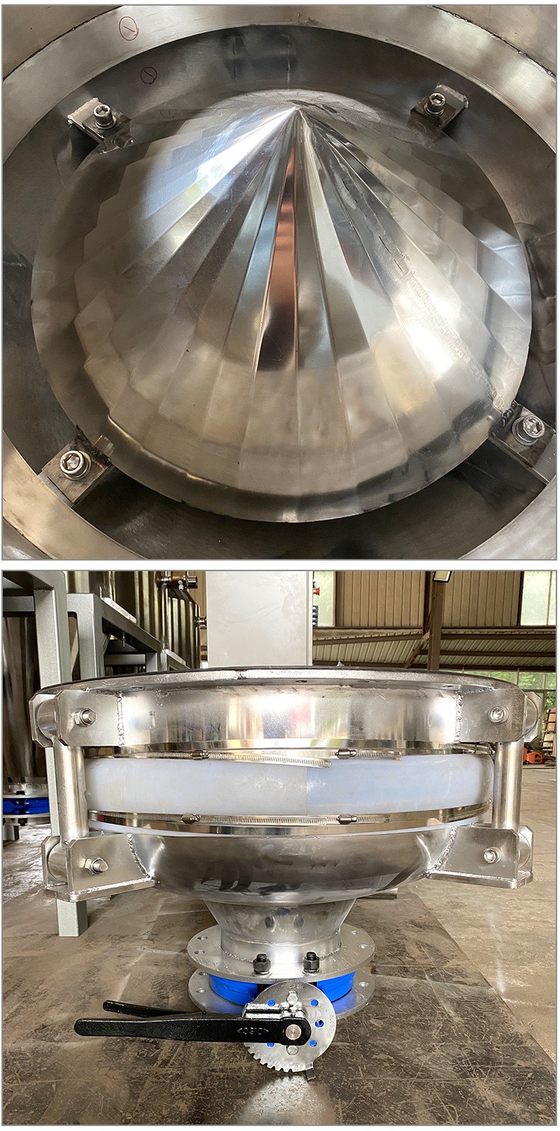 Product introduction振動給料斗破拱性能好,對于料倉內的各種粉狀及粒狀物料都能實現破拱和連續均勻排料,可消除不同粒度、不同比重的混合物料在進入料倉時的偏析現象。將振動電機接通電源,振動電機起振,其產生的激振力使給料斗在水平方向產生強烈的振動,此振動通過錐面或球面活化器將水平激振力分解為法向力和切向力,法向力呈放射狀傳遞到物料深處,切向力使物料受剪,從而消除倉內物料的起拱,使物料像流水一樣從出料口排出。切斷電源,振動電機停振,排料可停止。